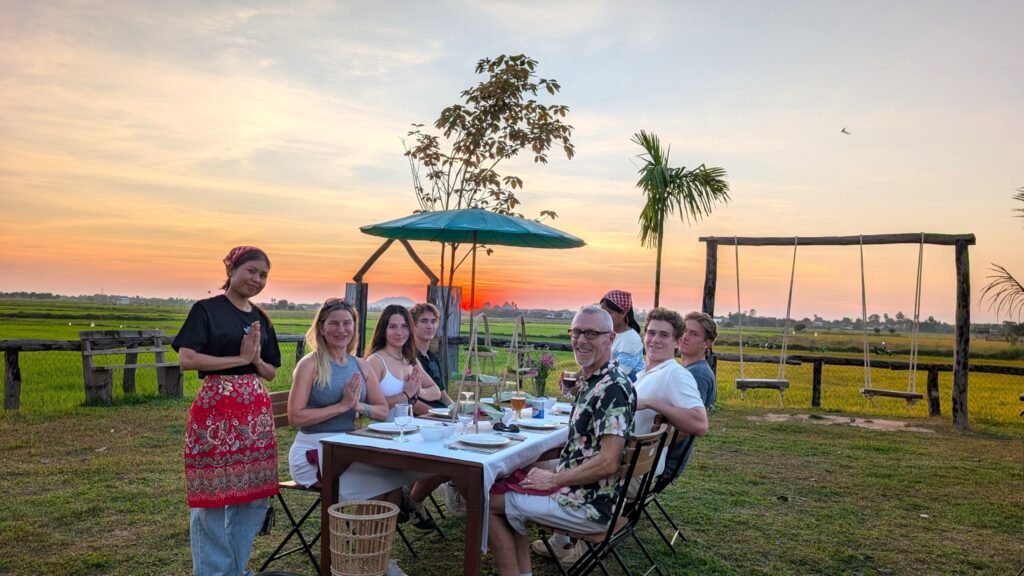 Arrive from 4:30 pm and unwind in the rice fields with a cold drink and light local snack as the sun sets over the countryside. The golden-hour views set the tone for a peaceful evening at Khmer traditional house. After sunset, enjoy a short stroll along our quiet village paths before being welcomed by the local ladies who prepare your home-cooked dinner. Served in our Khmer traditional wooden house, each dish is made from fresh ingredients and family recipes passed down through generations. In just over two hours, you’ll experience the warmth of Khmer hospitality, the beauty of rural life, and a simple, heartfelt meal in the heart of the countryside.